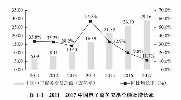 根据《2017中国电子商务报告》显示,2017年中国电子商务交易额达29.16万亿元人民币,同比增长11.7%。这其中,中国网上零售额达7.18万亿元,同比增长32.2%,占全年社会消费品零售总额的19.6%。如今的电子商务已然成为中过人消费行为的一个主要渠道,在资源配置上起到了关键性的作用。