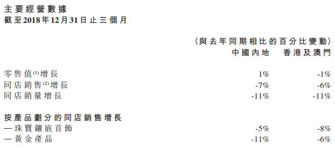 1月14日晚间,周大福发布三季度财报。报告显示,截至2018年12月31日止3个月,周大福在内地的零售值同比增长1%,同店销售同比减少7%,同店销量同比减少11%。周大福表示,受宏观环境不明朗影响,中国内地和香港及澳门市场的同店销售在第三季度下跌。但两大市场的同店销售均价依旧维持正增长。