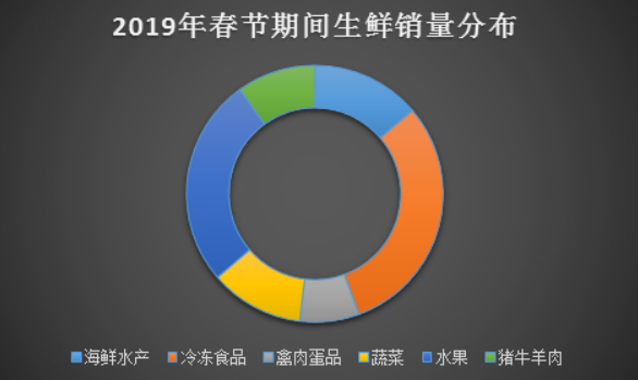 与去年同期相比,春节期间生鲜销售额同比增长最快的品类是:禽肉蛋品、冷冻食品、海鲜水产。
