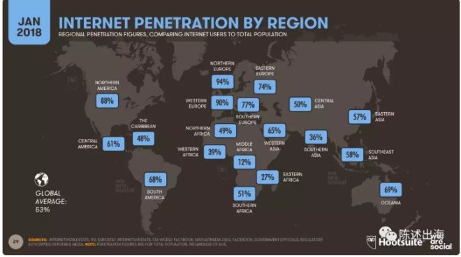 主要的新兴市场地区的互联网渗透率,如东南亚:58%,中东65%,东欧74%,中南美洲61%-68%等在2018年1月都超过了世界平均水平53%。