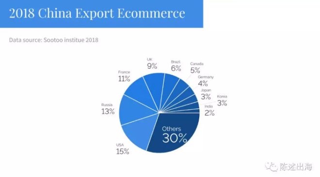 在现有的跨境电商交易量中,根据 Sootoo Institute 的统计,2018中国出口电商交易中,面向发达市场的占比再60%以上,新兴市场也已经占据一个不可忽视的比例。