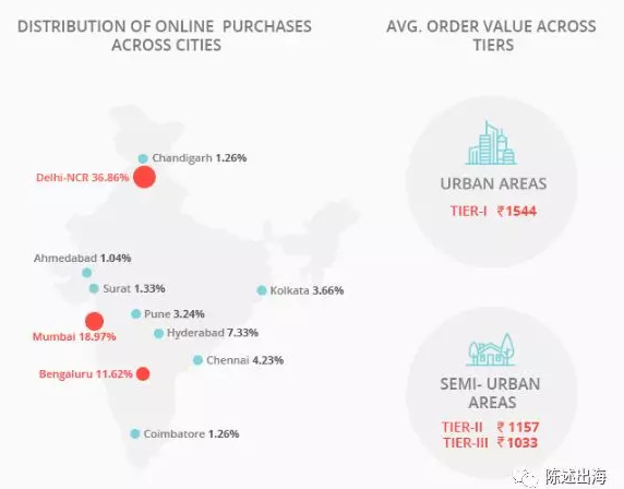 以新兴市场印度为例,新德里,孟买,班加罗尔和海得拉巴四个主要大城市贡献了超过70%以上的电商销售额。且具有更高的客单价50%+。