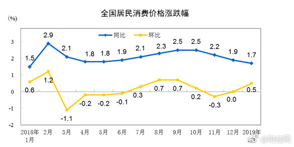 2019年1月份,全国居民消费价格同比上涨1.7%。其中,城市上涨1.8%,农村上涨1.7%;食品价格上涨1.9%,非食品价格上涨1.7%;消费品价格上涨1.3%,服务价格上涨2.4%。1月份,全国居民消费价格环比上涨0.5%。其中,城市上涨0.5%,农村上涨0.4%;食品价格上涨1.6...