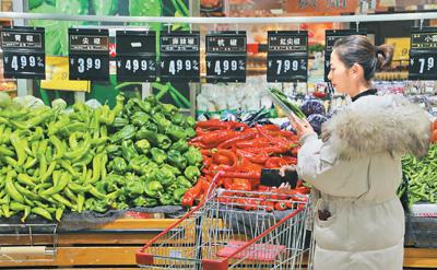 近年来,消费升级步伐加快,百姓在消费时对商品的品质要求不断提高,消费方式由实物消费更多地转向服务消费。1月10日,市民在山东省烟台市新世界百货的超市买菜。