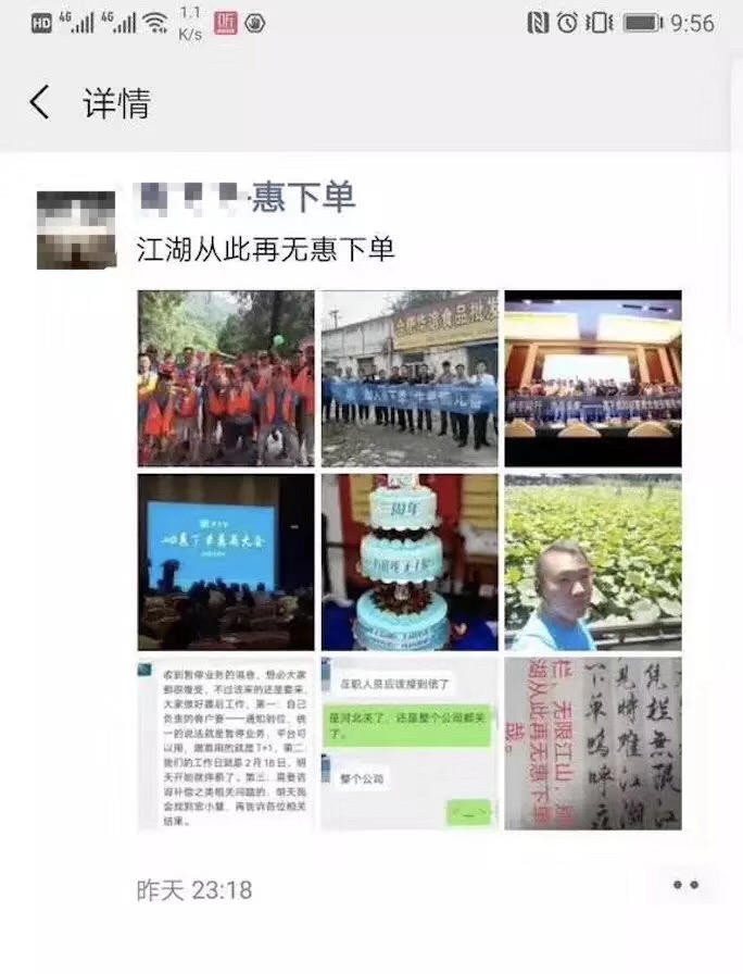 从惠下单内部群披露的图片我们可以看出,惠下单已通知市场全部业务员告知客户暂停业务,员工也会全员停薪,这也证实了惠下单停止运营的事实。在获取该消息后,新经销第一时间也向惠下单内部员工进行了求证,得到的信息是不仅是市场业务层面暂停,总部业务基本也处于停滞状态,但是这并不会对母公司赢销通业务产生影响,两家企业属于独立运营的公司。