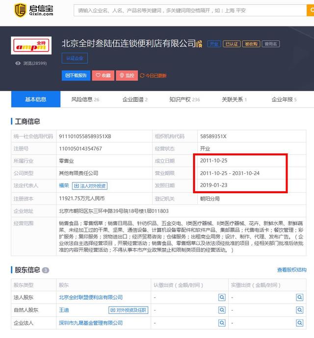 根据启信宝的数据显示,全时便利店的主体公司北京全时叁陆伍连锁便利店有限公司,注册于2011年11月25日,旗下有322家分支机构。2017年,全时进入成都、重庆、武汉等8个城市,启动了“百城百万”计划,表示要投资百亿元、五年覆盖“100个城市,100万个终端”。据其2018年7月披露的数据,当时的全时门店数就已接近800家,在北京就有400多家门店。全时便利店为复华控股旗下全资子公司。复华控股成立于2013年,实际掌舵人为王新。复华以资产运营、资产管理、产融投资为主要业务,主要从事地产、金融、环保、零售四大产业,对外投资的企业高达10家。