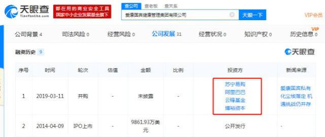 3月12日消息,据天眼查数据显示,3月11日,爱康国宾主体公司爱康国宾健康管理集团有限公司完成并购融资,投资方为阿里巴巴、苏宁易购、云锋基金、博裕资本。