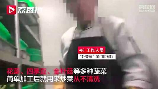 视频显示,外婆家某门店后厨内花菜、金针菇以及四季豆等多种蔬菜简单加工后便直接下锅,从不清洗,这些简单加工的菜品平时就放在后厨的架子上或者后厨的净菜区内,据工作人员介绍花菜、金针菇等蔬菜不洗已经成为饭店的潜规则,“眼不见心不烦就吃下去了,自己在家肯定洗”。另有一位工作人员表示,花菜一洗就烂了,往油锅里面一炸相当于高温消毒了。