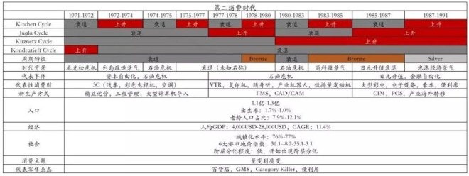 举个例子,上图是用“康波周期理论”复原的日本第一消费时代图。红色区域代表这个周期属于上升阶段,灰色代表衰退阶段。四个周期叠加的地方,就是消费发展的黄金周期。