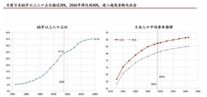 我们先来看看日本老龄化的情况。以65岁作为老龄人口线,从上图趋势看,2020年的时候 65 岁以上人口将占比 29%,至 2065 年时这一比例将上升到40%。而目前中国的老龄人口占比是15%,和90年代的日本相当。