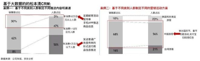 这些会员其实就是松本清的数据库。从上图可以看到松本清做 CRM 的逻辑。他们会把会员进行消费层级或者区域分类,针对性地推送内容或者策划活动方案。比如松本清几乎 70% 的来自于外国游客的销售额都是由中国人贡献的,所以他们就会举办国庆节、春节等专题活动。