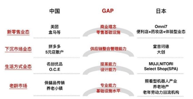 最后用一张图来总结下中国和日本目前的差距,主要的差距体现在四个部分:新零售业态、下沉市场业态、生活方式业态和老龄市场,分别对应的不足是:商业理念和零售基础设施、供应链整合管理能力(上面讲的大创)、提案和设计能力,以及专业能力和基础设施水平。