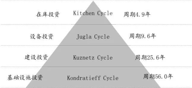 大家知道经济是有周期变化的,这里面又有四个嵌套的小周期。如上图所示,第一个叫在库投资,就是企业的库存投资周期,时长 5 年左右;再往下是设备投资周期,是 10 年左右;然后是房地产投资周期,是 25 年左右;而社会的基础设施投资期,是在 56 年到 60 年左右。