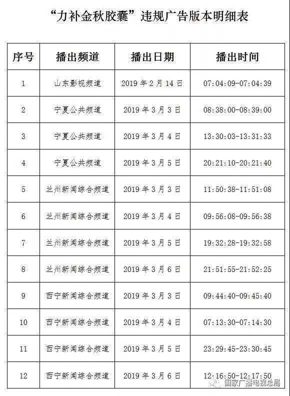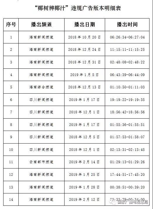 为严肃播出纪律,切实维护广大人民群众合法权益,根据相关法律法规规定,总局决定,自即日起,各级广播电视播出机构立即停止播出相关版本的“椰树牌椰汁”“力补金秋胶囊”和“强身牌四子填精胶囊”广告,并举一反三,全面清查所有在播和拟播广告,严把导向关,凡存在类似违规问题的,一律禁止播出,坚决杜绝此类违规问题。