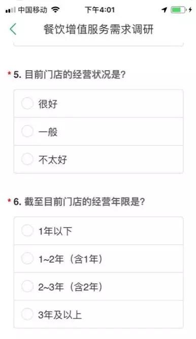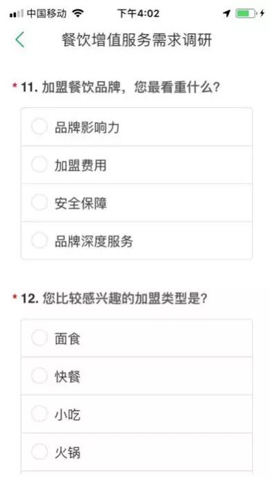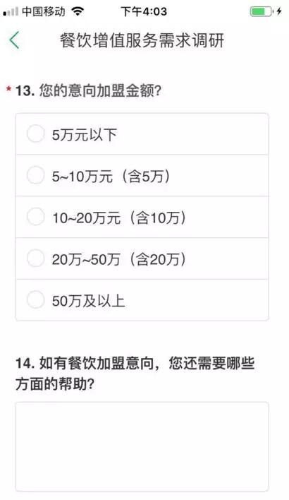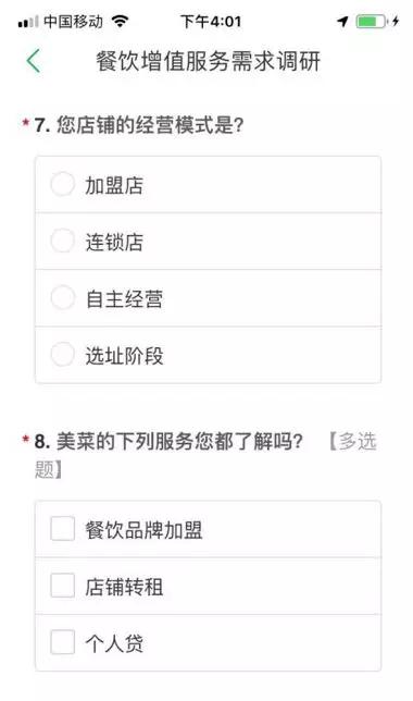 在美菜网悄悄发布的一份餐饮增值服务需求调研表里,亿邦动力了解到,该餐饮增值服务主要是做餐饮品牌的加盟业务,此外还包括店面转租业务和针对个人的贷款业务。调研内容包括用户所在城市、目前经营门店的种类、经营模式、对餐饮加盟了解程度、意向加盟餐饮种类和加盟金额等。调研表具体如下: