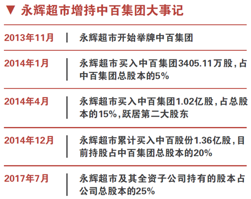 2017年7月7日,中百集团发布公告称,永辉超市全资子公司重庆永辉超市有限公司于2017年6月1日-7月7日通过深圳证券交易所的集中竞价交易系统买入中百集团股票34051143股。此次增持完成后,永辉超市及其全资子公司重庆永辉超市有限公司、永辉物流有限公司共持有的股本占公司总股本的25%。