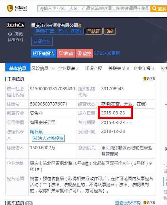 2011年,在江城重庆一家名不见经传的小型酒企出现了,这就是江小白。在川渝地区办白酒厂,如果这个人不是想不开了,那么一定是疯了,因为在西南地区可谓是中国白酒的天堂,从茅台、五粮液、剑南春,到泸州老窖、国窖1573、红花郎,几乎各大名品白酒是充斥其间,在如此激烈的竞争中,如果是办个小酒作坊都要考虑有没有足够的回头客可以购买白酒,更何况要办一个白酒企业,然而江小白就是办了。这家企业在2012年推出了第一款白酒,之后就一发不可收拾。根据启信宝的数据显示,江小白注册于2015年,注册资本1500万元,是一个相当年轻的企业。
