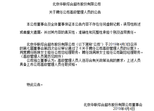龙商网消息:4月4日,北京华联综超发布公告称,公司聘任陈琳女士担任总经理职务,聘任饶满琳女士担任副总经理职务。