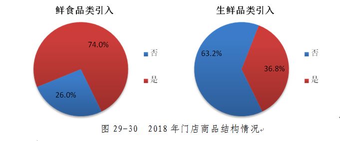 本次调查结果显示,在商品结构方面,2018年商品品类包含鲜食品类的门店占比74.0%,包含生鲜品类的占比36.8%。说明绝大多数门店比较重视鲜食品类的引入;而对于生鲜品类,多数门店仍然保持较为谨慎的态度。