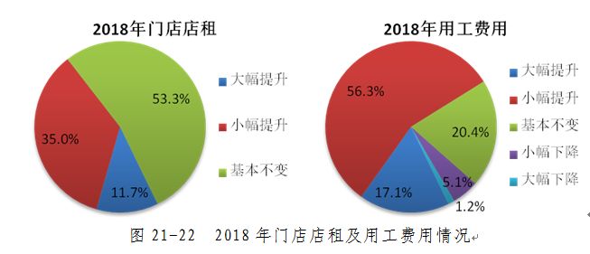 门店店租方面,2018年46%的门店店租出现了不同程度的上涨,店租的上涨对于门店的可持续运营带了的极大的威胁。有些门店会因为租房合同到期,店租的过度上涨而闭店。
