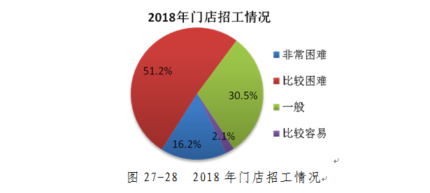 同时在门店招工方面,2018年56.2%的门店招工比较困难,16.2%的门店招工非常困难。