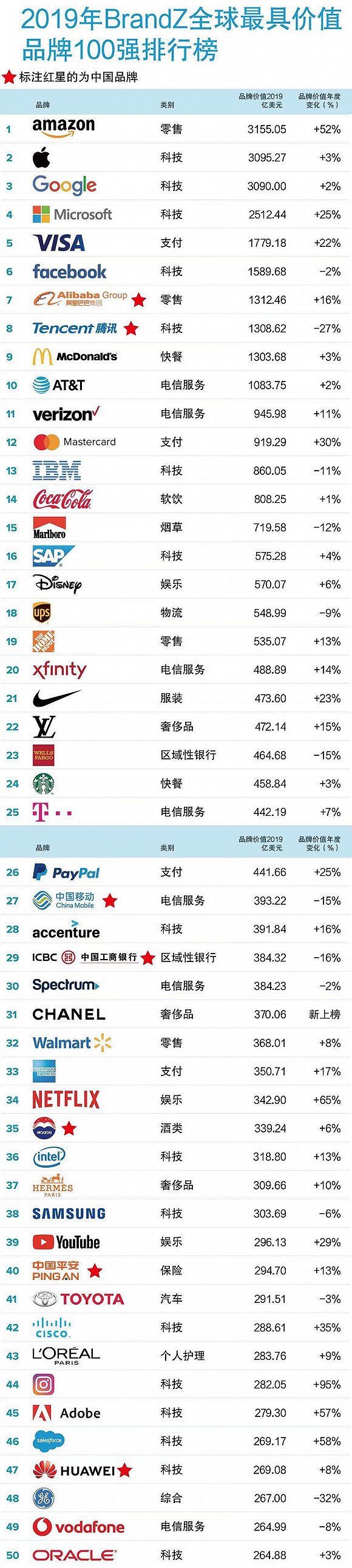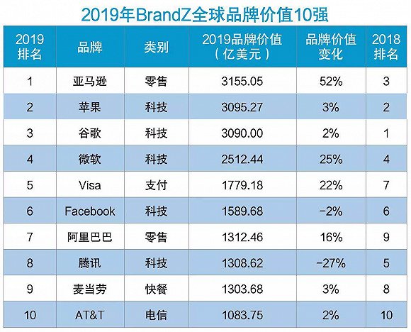 2019年,中国军团中的最高排名被阿里巴巴夺得(第7名),其品牌价值在2019年增长了16%,达到了1312亿美元,相比去年上升两位。这也是在这份榜单中阿里巴巴首次超越腾讯,腾讯的品牌价值在2019年下跌27%至1309亿美元,排名也下降了3位,位列全球第八。华为的品牌价值基本与去年持平,为全球第47位,百度惨跌22位,位列第63位。