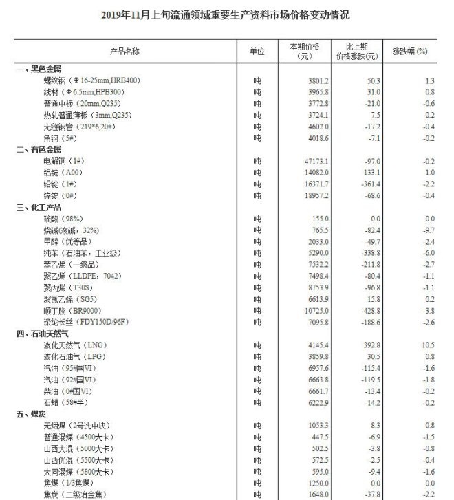 11月14日,统计局公布《2019年11月上旬流通领域重要生产资料市场价格变动情况》。