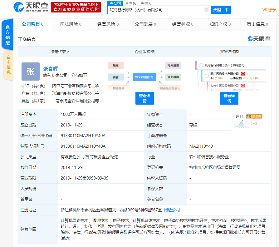天眼查数据显示,11月29日,阿里巴巴成立了斑马智行网络(杭州)有限公司,注册资本为1000万元人民币,法定代表人为菜鸟ET实验室主任张春晖。公司经营范围包括计算机网络技术、通信技术 、电子技术、计算机系统技术等。斑马智行网络(杭州)有限公司由浙江天猫技术有限公司持股70%,淘宝(中国)软件有限公司持股30%,疑似实际控制人为淘宝中国控股有限公司。