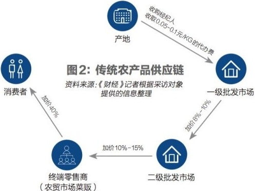 一位生鲜业内人士给《财经》记者算了一笔账。农产品从产地进入物流体系,通过收购人到达一级批发市场,会产生一笔代办费,通常为一斤0.1元或者5分钱,一级批发市场加价8%到10%,流通到北京新发地这样的二级批发市场,终端零售商再付出多10%到15%的代价从二级批发市场拿货,最终加价40%卖给消费者。