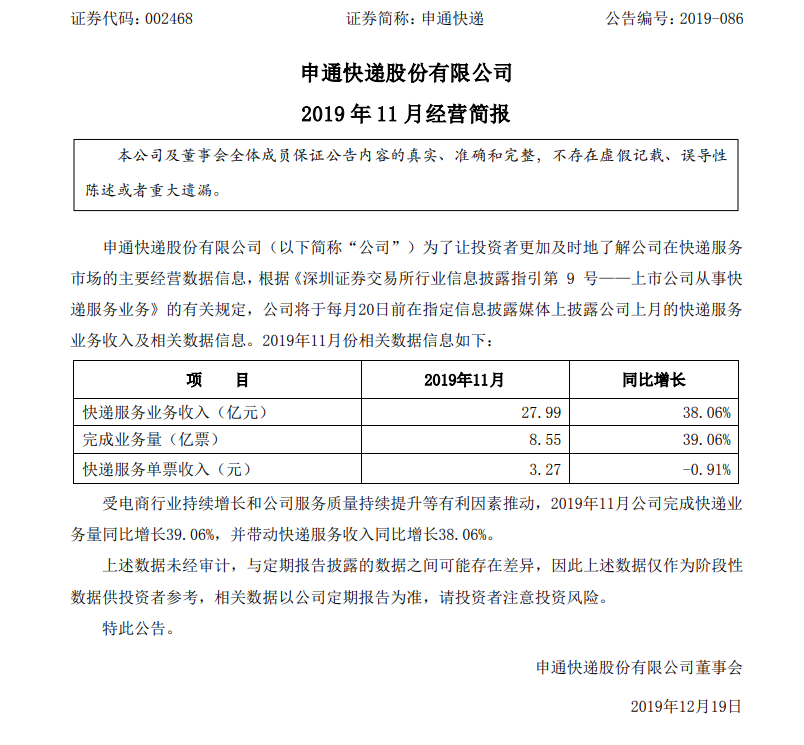 申通快递发布公告称,11月快递服务业务收入27.99亿元,同比增长38.06%。完成业务量8.55亿票,同比增长39.06%。快递服务单票收入3.27元,同比下降0.91%。业绩受电商行业持续增长和公司服务质量持续提升等有利因素推动。