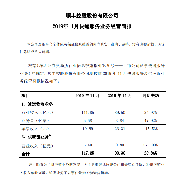 顺丰控股发布公告称,11月速运物流业务营业收入111.85亿元,同比增长24.97%;业务量5.68亿票,同比增长47.92%;单票收入19.69元,同比下降15.53%。供应链业务收入5.40亿元,同比增长575.00%。