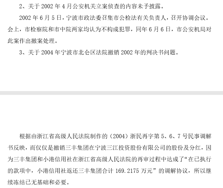 其次,针对2002年4月公安机关立案侦查的内容未披露、2004年宁波市北仑区法院撤销2002年的判决书两项问题均作出解释,并声明三江购物及实际控制人不存在报道中所述的用隐瞒、虚假的方式挪用资金、涉嫌违规低价转让股权致国有资产流失的情况。