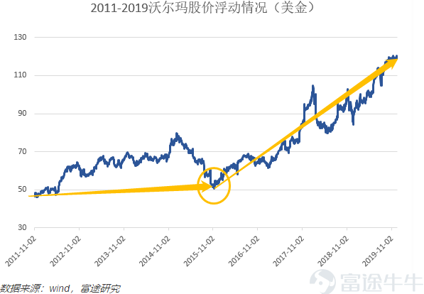 近年来公司财报数据表现依旧平稳,没有出现较大的波动。价格的上涨源于估值推动。利用wind的中PS的数据我们可以看到,公司近两个月的股价超过了平均最高估值。主要驱动来源于沃尔玛转型初步成功给投资者带来的信心。现在的价格持续创造新高,因为所有人都在赌,沃尔玛这几年来布下的局,在未来能否成功变现?这样的思维很熟悉,投资者投资沃尔玛的思维也从传统零售企业转型成了互联网企业。董明伦完成了沃尔玛的互联网之梦的第一篇章。