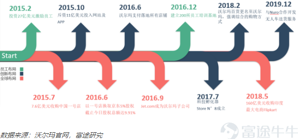2015年7月,公司宣布以7.60亿美金收购一号店100%股份;2016年6月,与中国最大线上零售企业,京东建立战略合作关系,持股京东10%的股份;2016年9月,33亿美元收购jet.com,美国头部电商,并于2017年收购5家美国头部电商服饰店;2018年,以160亿美金收购印度最大电商Flipkart,成为沃尔玛全球电子商务计划的核心,全力进军印度市场。