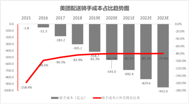 过去5年,美团骑手成本占外卖佣金的比重在持续下降:2016年,其占比高于98%;2018年,这一占比下降至83.9%。据见智研究所测算,2019年占比将继续下降,或至81.3%。