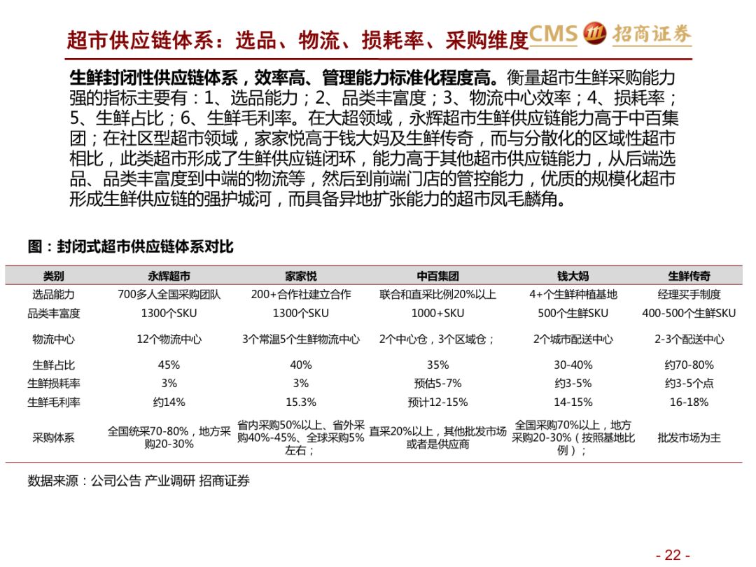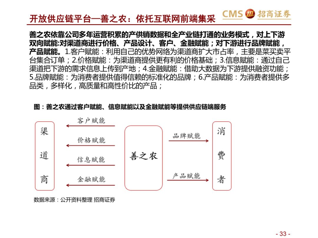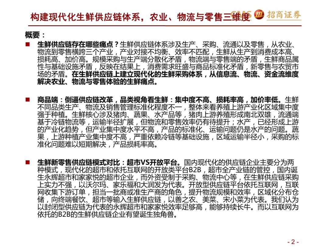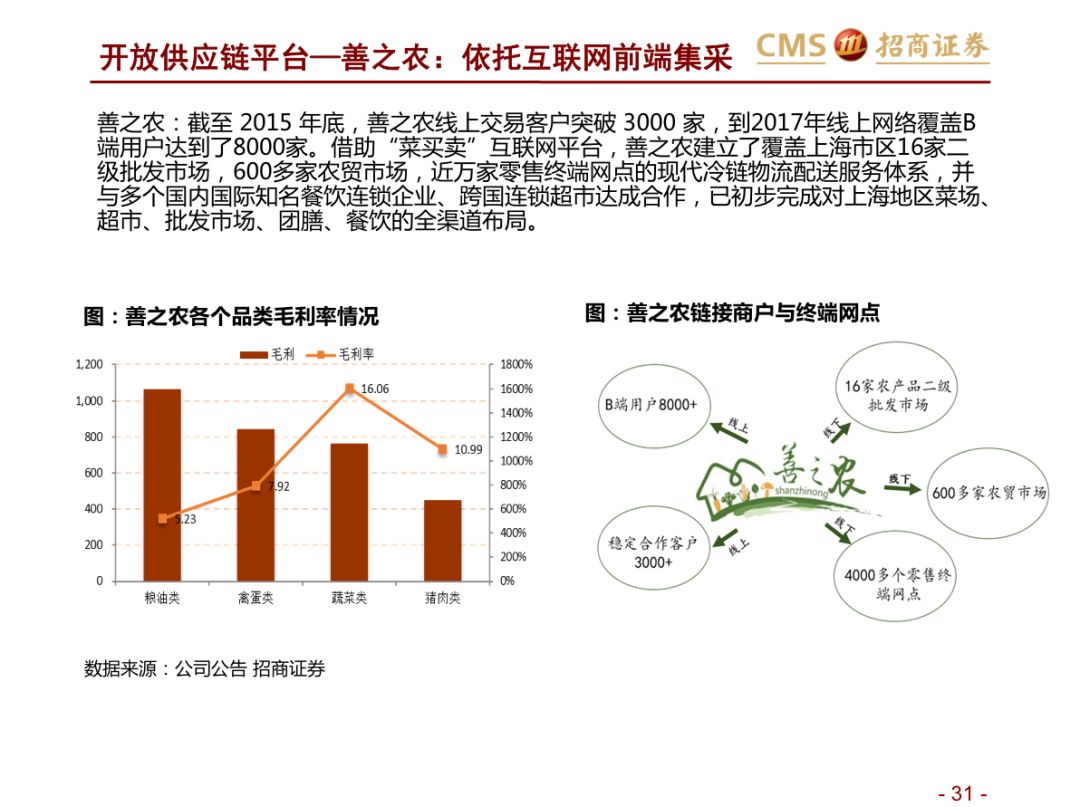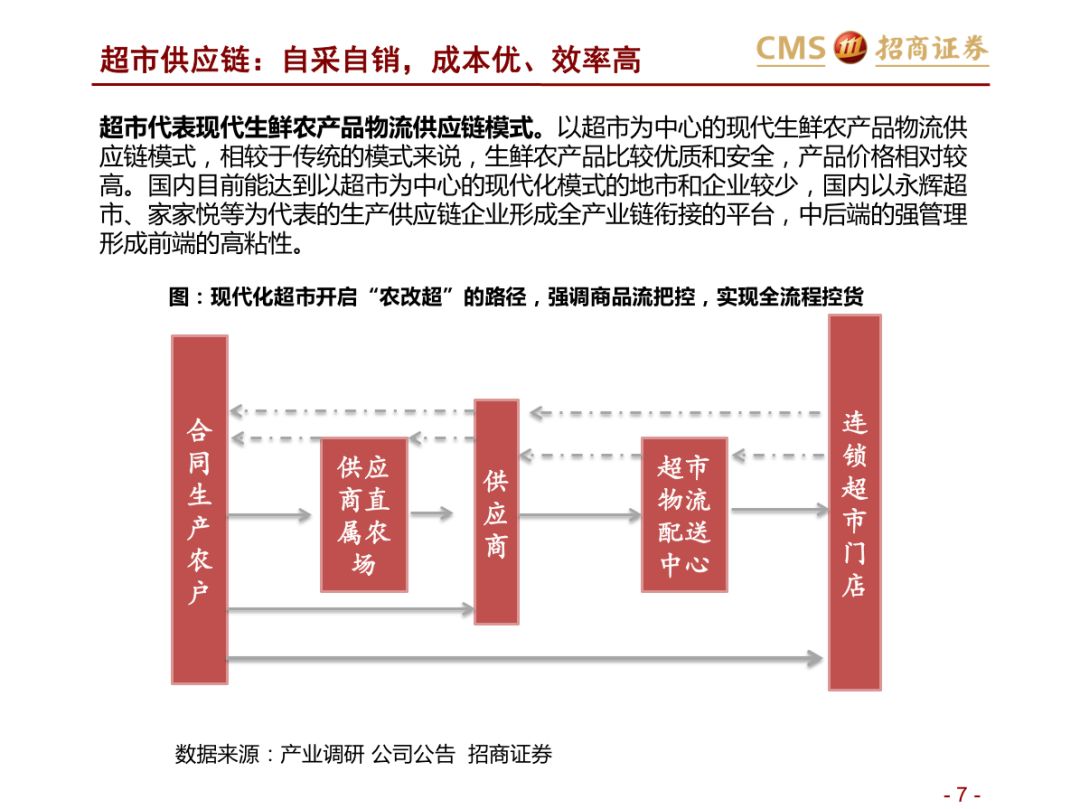 生鲜新零售供应链模式对比:超市VS开放平台。国内现代化的供应链企业主要分为两种模式,现代化的超市和依托互联网的开放类平台B2B,超市全产业链的管控,国内诞生永辉超市和家家悦的超市企业,而外资受制于采购、物流中心等,在生鲜供应链采购上实力不强,以沃尔玛、家乐福和大润发为代表。开放型供应链平台依托互联网,互联网收集下游订单,担当一批商或准生产商的角色,提升物流规模和效率,区域化分布仓储,向终端餐饮、超市等输入生鲜供应链,以善之农、美菜、宋小菜为代表。我们认为以封闭型供应链为代表的永辉超市和家家悦效率足够高,能够持续长牛。而以互联网为依托的B2B的生鲜供应链企业有望诞生独角兽。