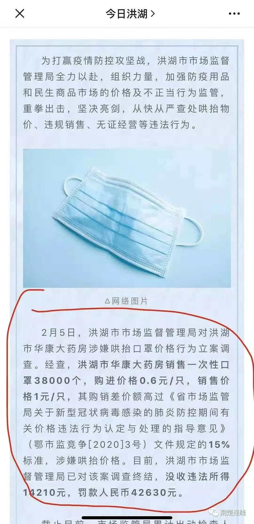 “今日洪湖”在名为《哄抬口罩价格,罚》的推文中称,洪湖市华康大药房0.6元购进的一次性口罩按1元销售的行为,超出了湖北省市场监管指导文件提出的购销差价不超过15%标准,故决定没收华康大药房违法所得14210元并罚款42630元。