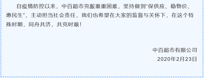 自疫情防控以来,中百超市克服重重困难,坚持做到“保供应、稳物价、惠民生”,主动担当社会责任,我们也希望在大家的监督与关怀下,在这个特殊时期,同舟共济,共克时艰!