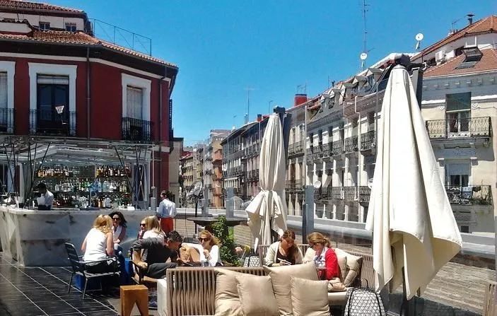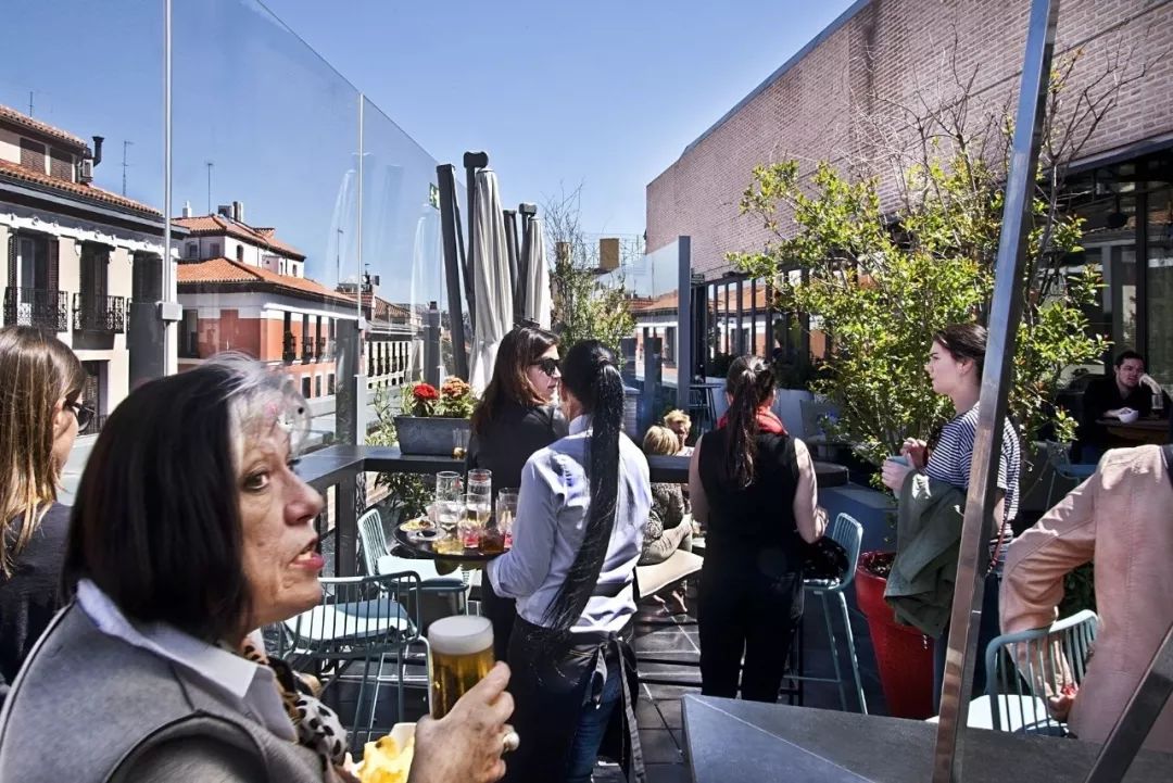 通往三层的只有楼梯,砖瓦与黑色金属材质呼应了建筑外立面。这里是马德里唯一一家位于市场屋顶的户外餐厅,不仅有国际食谱、种类繁多的鸡尾酒,还有品酒会、火腿切割大师班等有趣的研讨会。