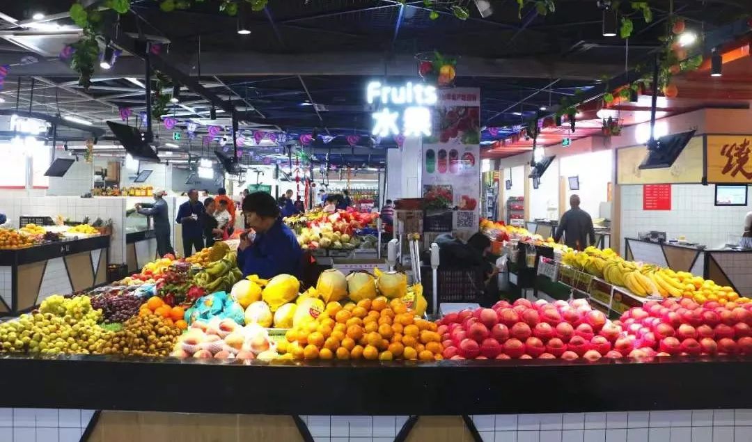 内部区域通过头顶吊灯颜色进行区分,蔬果区灯光为冷色,肉禽蛋区灯光为红色。地板为灰色,凸显商品色彩丰富。