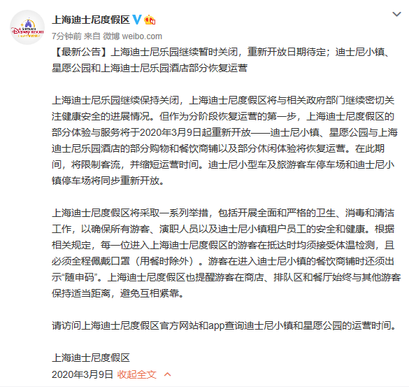 上海迪士尼乐园继续暂时关闭,重新开放日期待定;迪士尼小镇、星愿公园和上海迪士尼乐园酒店部分恢复运营上海迪士尼乐园继续保持关闭,上海迪士尼度假区将与相关政府部门继续密切关注健康安全的进展情况。