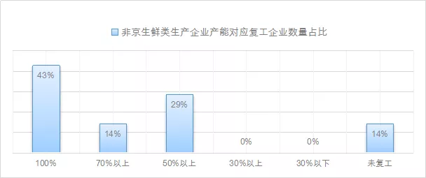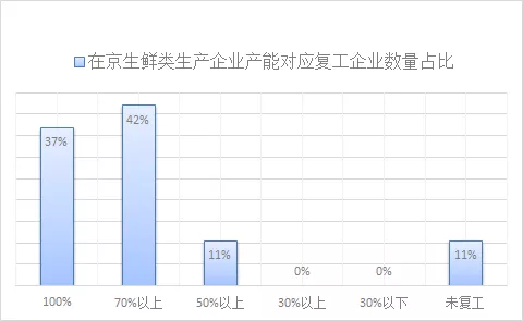 非京生鲜类生产企业中总体复工率也达到85%,平均产能67%。最早复工时间1月26日,其中产能达到以往正常值100%的企业占比37%、达到70%及以上的占比42%、50%以上的占比11%,未复工企业占比11%。