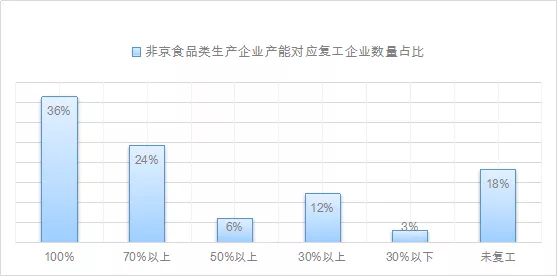 非京食品类生产企业中总体复工率达到81%,平均产能64%。最早复工时间2月4日,其中产能达到以往正常值100%的企业占比36%、达到70%及以上的占比24%、50%以上的占比6%、30%以上的占比12%、而不足30%的占比3%,未复工企业占比18%。