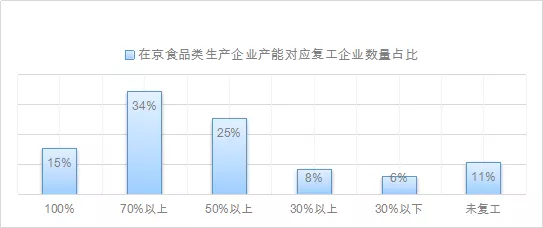 在京食品类生产企业中总体复工率达到89%,平均产能60%。最早复工时间1月26日,其中产能达到以往正常值100%的企业占比15%、达到70%及以上的占比34%、50%以上的占比25%、30%以上的占比8%、而不足30%的占比6%,未复工企业占比11%。