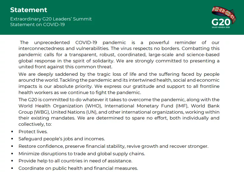 据联合声明,G20正向全球经济注入5万亿美元。与此同时,要达到保护生命;保障人民就业和收入;恢复信心,保持金融稳定,恢复增长和恢复强劲;尽量减少对贸易和全球供应链的干扰;向所有需要援助的国家提供帮助;协调公共卫生和财政措施等六大目标。