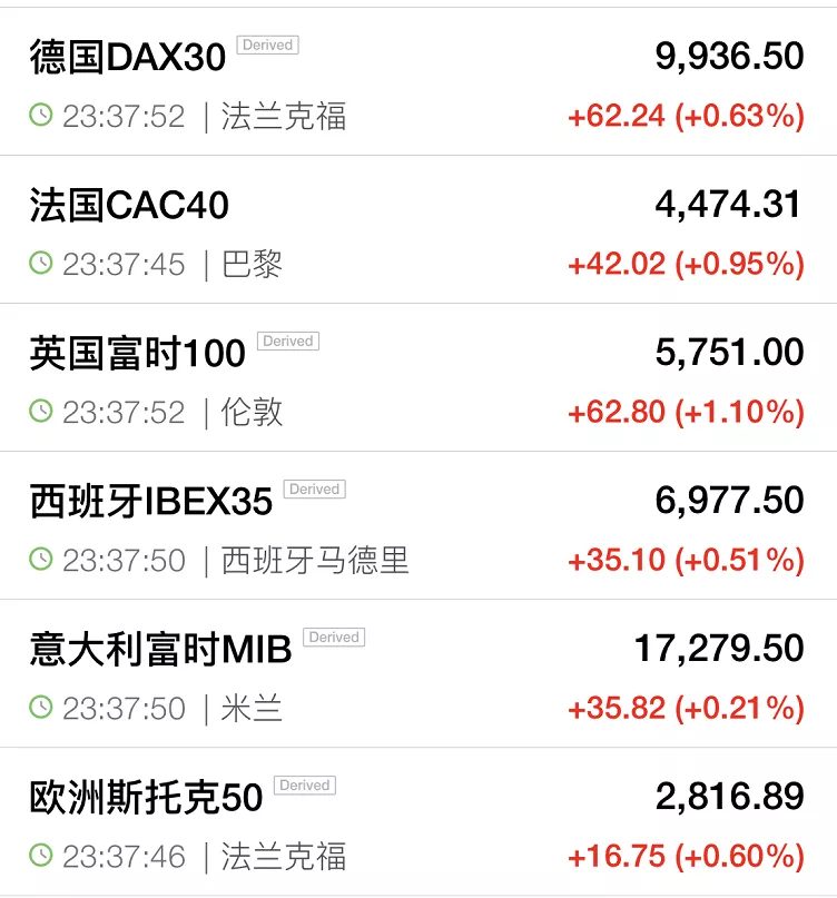 在G20联合声明发布之后,全球市场反应非常正面。美国股市再度大涨。截至发稿时间,道指涨幅扩大至1200点,涨幅超过5%,波音涨约16%领跑其成分股,美国运通涨超9%,可口可乐涨超8%,蓝筹股苹果涨超2%;纳指涨近4%,标普500指数涨近5%。欧洲市场亦由杀跌转为全线翻红。