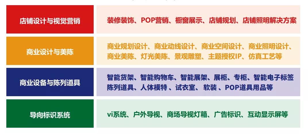 零售商业的扩张,消费者对于产品功能的需求和审美需求的提升,这就对终端服务供应环节提出了更高的需求。为此,展会聚焦商业终端展示设计,整合设计与美陈行业,挖掘汇聚来自不同领域深耕多年的品牌企业,集中展示店铺设计与视觉营销、商业设计与美陈、商业设备与陈列道具、导向标识系统等四大品类,优质丰富的资源+靠谱的资源方,简直为设计与美陈人奉上了一场资源盛宴。