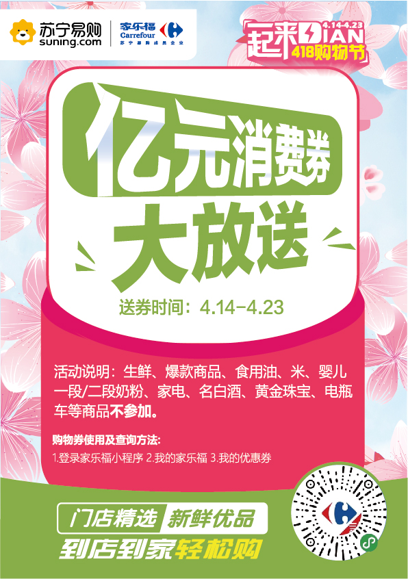 4月9日,家乐福正式宣布将面向全国消费者发放总额过亿的家乐福消费券,旨在提振市民消费信心,促进消费回暖。据悉,家乐福“一起来DIAN 418购物节”将于4月14日至23日在全国209家门店同步举行。期间,凡在线下门店消费满199元,即可获赠总值100元的消费券(5张20元消费券),消费券可在指定期间使用。