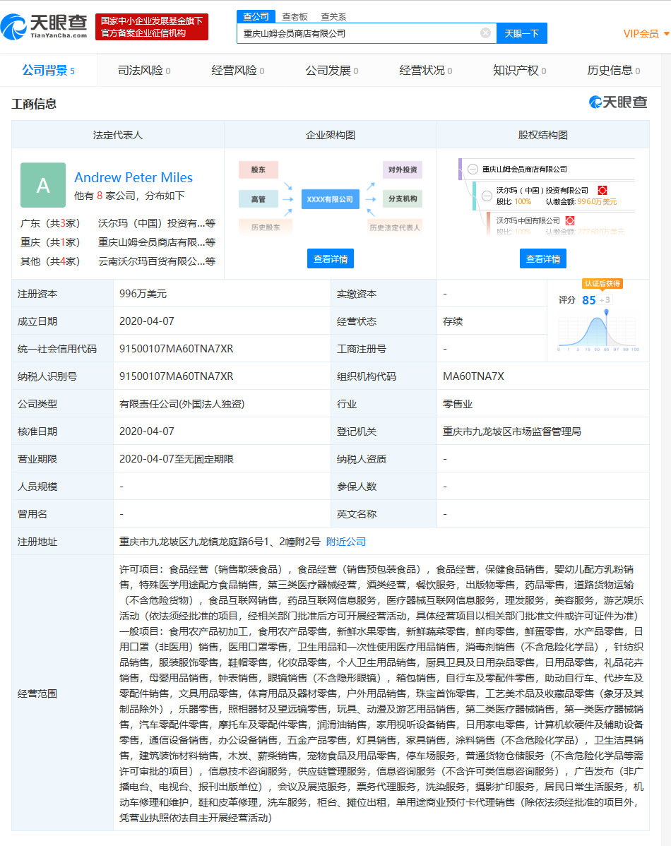 龙商网消息:天眼查数据显示,近日,沃尔玛(中国)投资有限公司新增对外投资,全资成立子公司重庆山姆会员商店有限公司。该公司成立于4月7日,注册资本为996万美元,法定代表人为Andrew Peter Miles,经营范围包括特殊医学用途配方食品销售,第三类医疗器械经营,药品零售,食品互联网销售,药品互联网信息服务,医疗器械互联网信息服务,医用口罩零售,卫生用品和一次性使用医疗用品销售,消毒剂销售等。