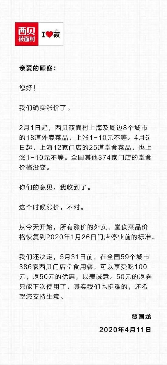 紧接着,同样有涨价行为的西贝,今天也出面道歉称恢复原价。西贝董事长贾国龙发公开信:就近期菜品涨价事件向消费者致歉并表示并表示菜品价格将恢复到门店停业前标准。